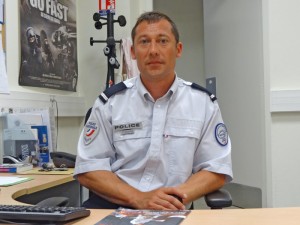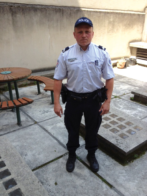 « J’ai découvert le métier de policier pendant mon service militaire. J’ai passé le concours puis je suis entré à l’école en 2000, où je suis resté un an en faisant des stages. Puis, j’ai commencé à Paris où je suis resté 3 ans en police de proximité. J’ai ensuite été muté à Lyon et depuis 2007 je suis en police secours à Bourg. On travaille par cycle : 4 jours de travail, 2 après-midi (12 h 50 – 21 h) puis 2 matins (4 h 50 – 13 h) et 2 jours de repos. Il n’y a pas vraiment de journée-type. On peut passer, mais c’est rare, 2-3 heures sans intervention et dans ces cas-là on est en patrouille, en binôme au moins. C’est un métier très varié avec différentes missions : problèmes de circulation, de voisinage, familiaux, constatation de délits… On se doit d’être à l’écoute du citoyen, à son service. C’est un métier que j’aime et si, comme c’est mon cas, ce n’est pas forcément une vocation, il faut avoir envie de le faire, ce ne peut être un métier par défaut. »