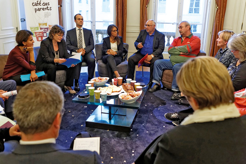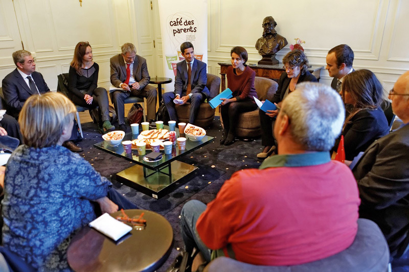 Un constat qui a poussé la ministre à axer sa politique sur un rapprochement entre école et parents, et, plus largement, à favoriser la « co-éducation ». La « co-éducation », selon le CNIRE, « ne signifie pas une confusion des rôles, mais la prise de conscience réciproque et la mise en pratique de la nécessaire complémentarité de l’action de chacun, enseignants et parents, écoles et familles, tant sur le plan strict des apprentissages scolaires que du point de vue plus général de l’éducation de la personne. » Ce principe est d’ailleurs inscrit dans la loi d’orientation du 8 juillet 2013 où il est précisé que l’école « se construit avec la participation des parents, (…) s’enrichit et se conforte par le dialogue et la coopération entre tous les acteurs de la communauté éducative. » « Si l’on parle de co-éducation, si l’on a envie de reconnaître une place aux parents à l’école, il faut aussi commencer par les accueillir ici, au ministère », explique la ministre pour justifier la mise en place des Cafés des Parents.