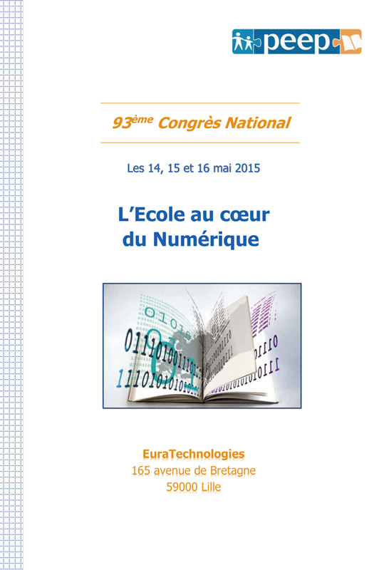 Les 14, 15 et 16 mai 2015, la Peep tiendra son 93e Congrès national à Lille. Thème de ce congrès et de la table ronde qui aura lieu le premier jour : « l’Ecole au cœur du Numérique ». Trois ateliers sont également au programme : un concernant l’enseignement supérieur (organisé par Peep-Sup), un second sur le thème du handicap, et un troisième à propos du civisme et de la citoyenneté à l’école.