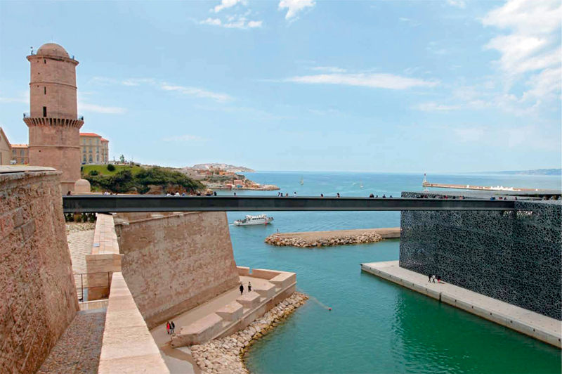 Aquelques encablures du Vieux port de Marseille, le Mucem impressionne par son architecture spectaculaire, constitué de deux grands ensembles reliés par une passerelle : le « J4 », nouveau bâtiment carré de 72 mètres de côté et le fort Saint-Jean, monument historique entièrement restauré.