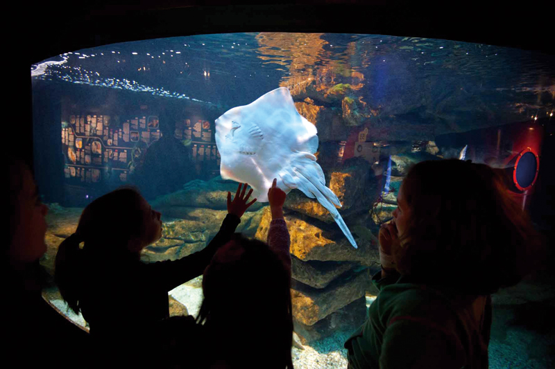 Direction ensuite le pôle « Océan », avec ses 17 aquariums thématiques qui reconstituent les fonds marins. Le plus impressionnant : l’aquarium tropical de 11 mètres de profondeur qui nous plonge dans la vie foisonnante d’une faille des milieux tropicaux. Plus d’un millier de poissons évoluent sur un plateau corallien : poissons chirurgiens, empereurs, poissons vaches, poissons-clowns… Grâce aux bruitages, aux jeux de lumière, petits et grands seront totalement immergés dans l’ambiance des profondeurs. Et même plus ! Le bassin tactile permet aux enfants de plonger les mains dans l’eau pour caresser raies et autres poissons dociles, en particulier les requins émissoles.