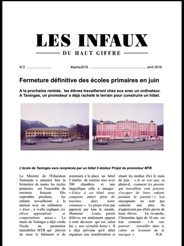 Ancienne journaliste, Rose-Marie Farinella puise dans son expérience passée pour sensibiliser une classe de CM2, de l’école de Taninges en Haute-Savoie, aux fausses informations. « J’ai construit un scénario pédagogique sur trois axes : comprendre ce qu’est une vraie information, définir ce qu’est une fausse information et savoir utiliser Internet et les réseaux sociaux, qui peuvent être des contenus fantastiques et créatifs, à condition de savoir rester vigilants », détaille Rose-Marie Farinella. Interventions de journalistes professionnels, improvisations entre les élèves, analyse des gros titres de la presse, création d’un journal parodique (voir visuel ci-contre)… L’enseignante et les élèves analysent les médias dans les moindres détails. Non seulement les élèves aiguisent leur esprit critique, mais la démarche de Rose-Marie Farinella les aide à devenir de bons cybercitoyens, en faisant barrage aux idées haineuses, racistes ou complotistes. La mission accomplie, ils reçoivent un diplôme d’« apprenti hoaxbuster », lors d’une cérémonie où chacun prête serment sur la souris de l’ordinateur : « Avant de partager ou d’utiliser une information, toujours je la vérifierai ».