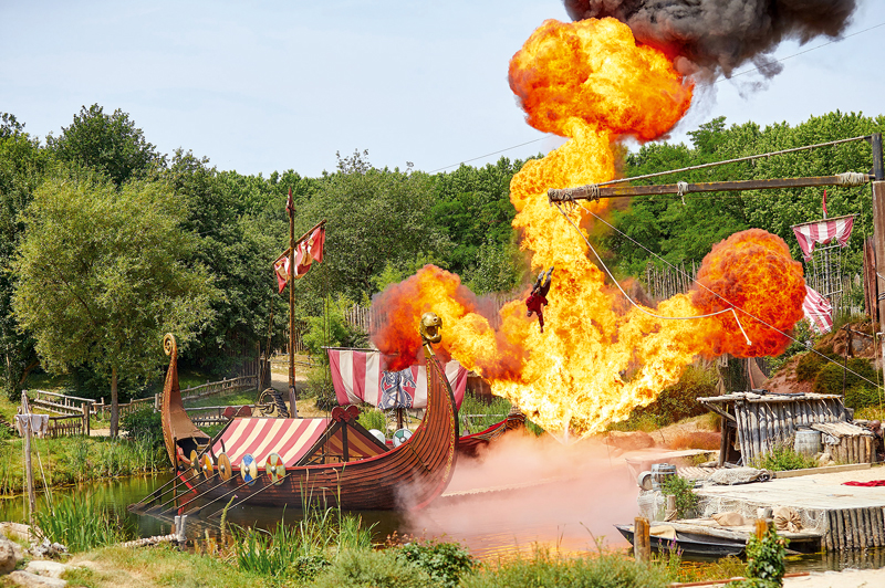 Ici, point de manèges. La force du Puy du Fou réside dans des mises en scène qui rassemblent des milliers de cascadeurs, comédiens, danseurs… Les spectacles sont construits de façon à enchaîner les effets de surprise, en alliant la présence humaine sur scène à la technologie. « La présence importante d’une machinerie de grande envergure permet des effets spéciaux gigantesques, qui se déroulent en direct sous les yeux des spectateurs. Au Puy du Fou, il n’y a pas d’images virtuelles, tout est en images réelles », ajoute le président du Parc.
