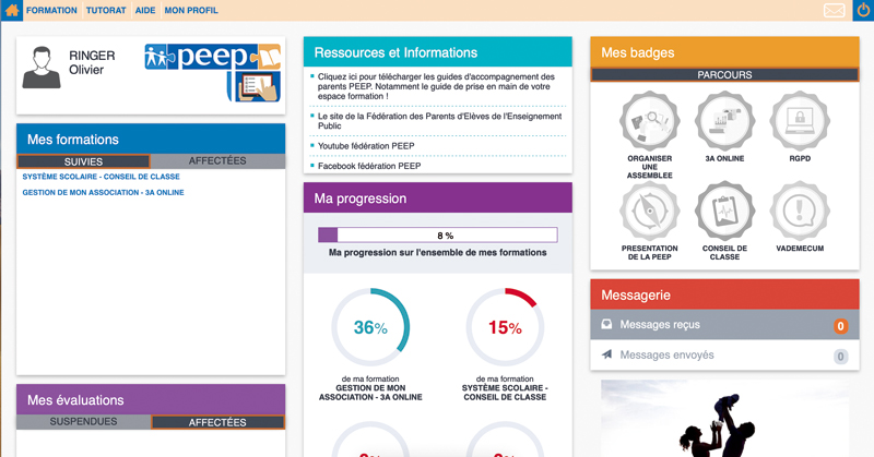Pour accéder à la plateforme, rendez-vous à l’adresse formation.peep.asso.fr, et connectez-vous avec l’identifiant et le mot de passe qui vous ont été fournis. Un tableau de bord personnalisé vous permettra de suivre votre progression dans les formations (voir ci-dessous).