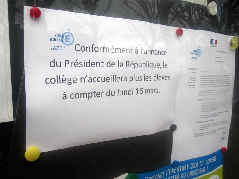 Les crèches, écoles, collèges et lycées sont uniquement ouverts pour les enfants des « personnels dérogatoires » (personnels hospitaliers, infirmières libérales, salariés des EHPAD, personnels préfectoraux…). Les parents doivent présenter un justificatif de leur emploi et prévoir le pique-nique (les cantines étant fermées). Les enfants sont répartis par petits groupes : pas plus de 10 par salle, et avec des récréations à horaires séparés.