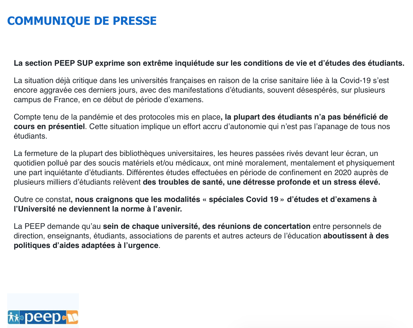 La situation perdure, la crise s’amplifie. Et le gouvernement tarde à prendre à la mesure de cette détresse, comme l’a regretté le 14 janvier la section PEEP SUP, exprimant « son extrême inquiétude sur les conditions de vie et d’études des étudiants  ».